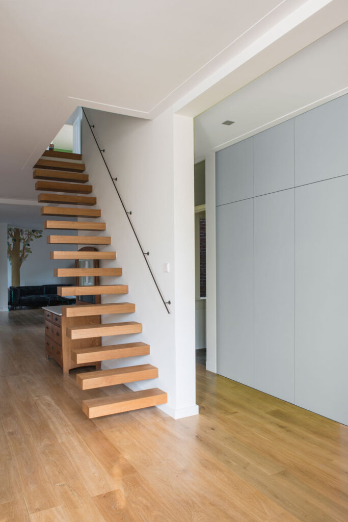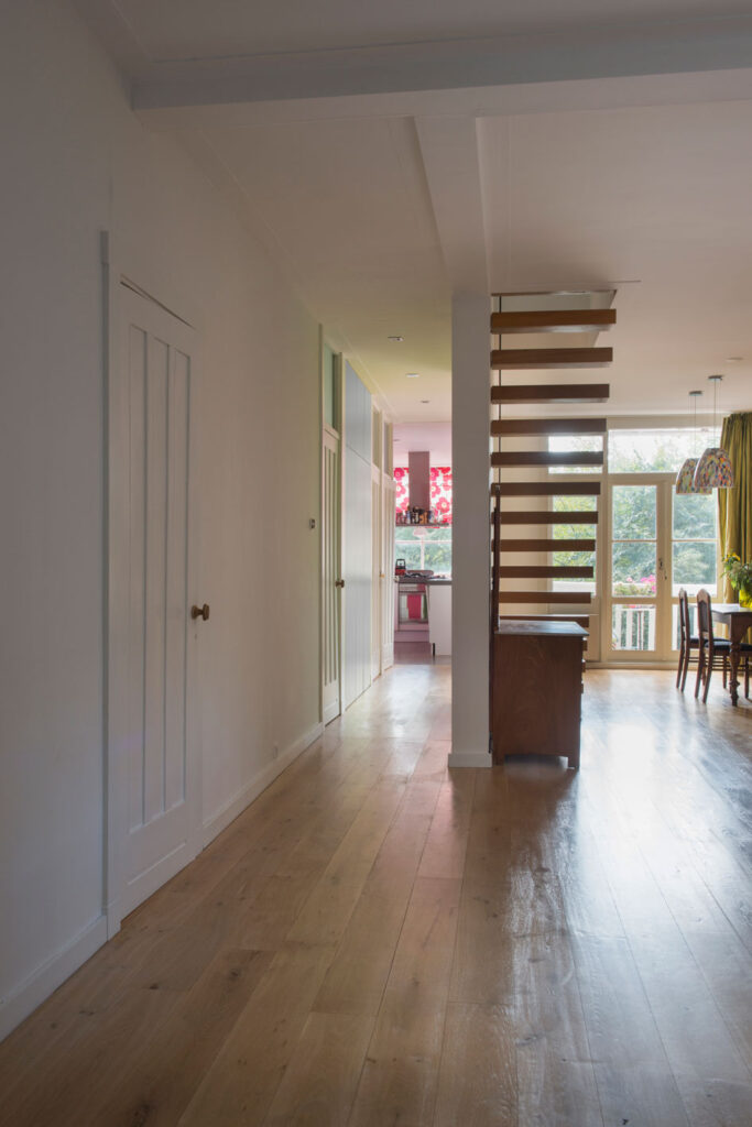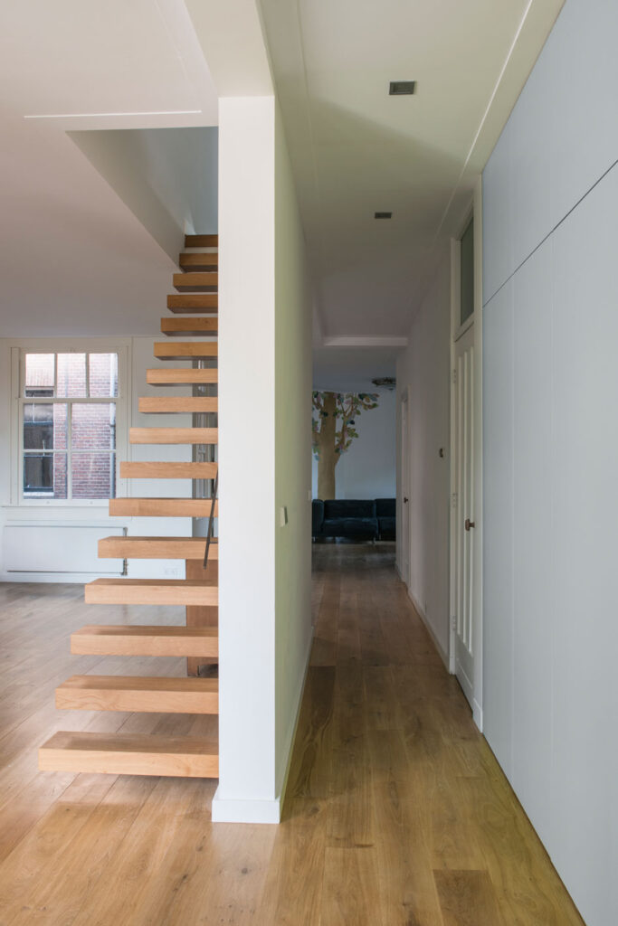 De woning, gelegen aan het Vondelpark, is uitgebreid met een functioneel ingedeelde zolderverdieping voor slapen en werken, terwijl de open woonruimte op de derde verdieping draait om ruimtelijke beleving in alle richtingen. Een interne zwevende trap vormt het centrale element in de vernieuwde plattegrond, en authentieke antieke elementen worden hergebruikt in het interieur.